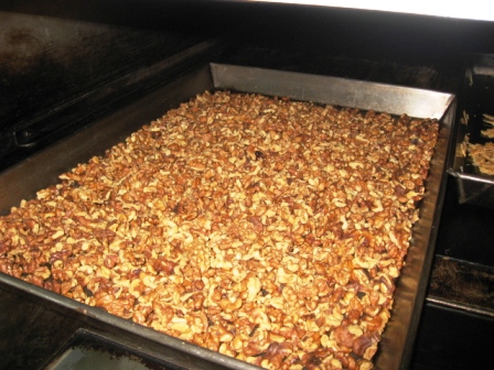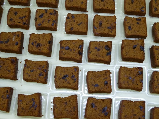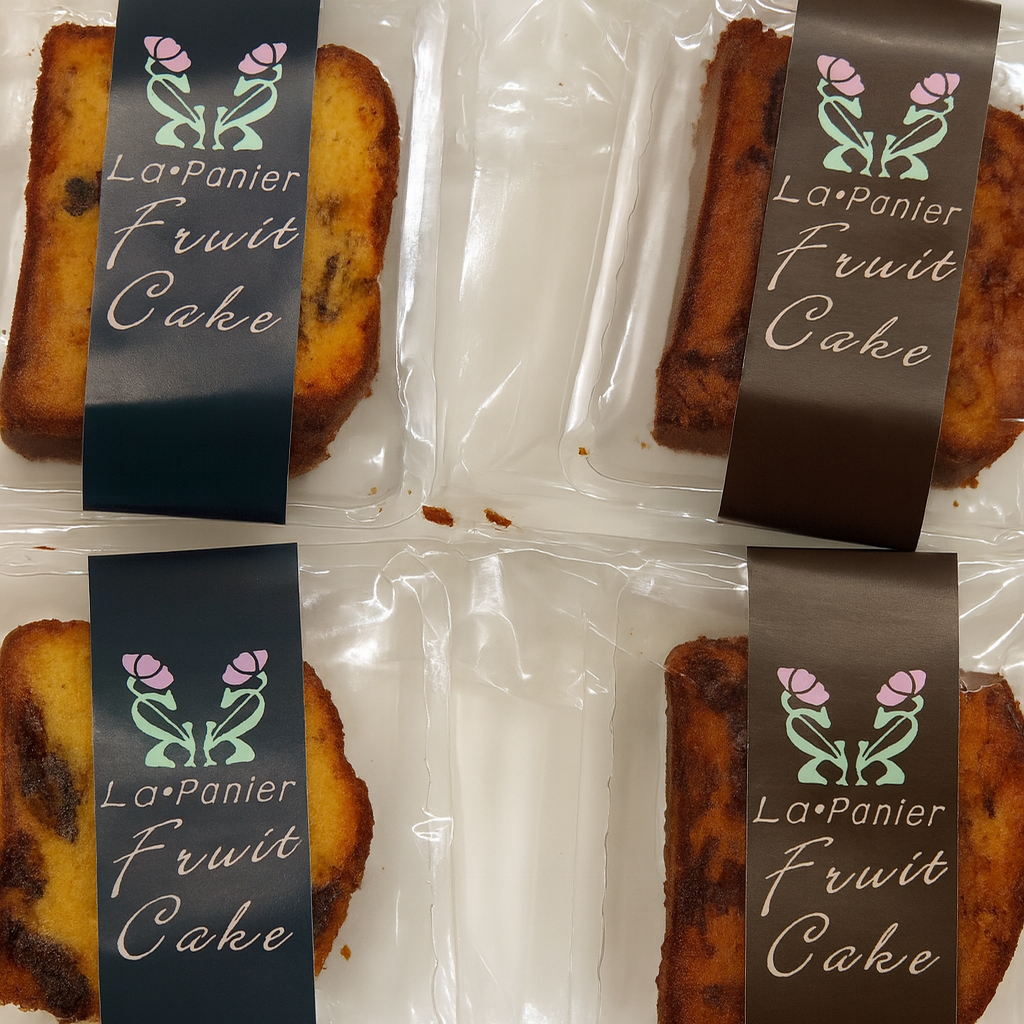 レーズン、オレンジピール、チェリー、クルミ、シナモン、ナツメグをブランデーとラム酒で漬けたフルーツを使い、カラメルで色を付けた濃厚なフルーツケーキ